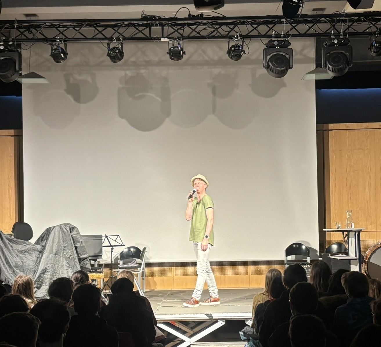Im 2. Block fand das amüsante Programm „Schlechte Karten für Jupiter“ für die 6. und 7. Lateinklassen statt. Am Anfang erzählte Björn Puscha uns etwas über sein Leben und wie sein Interesse für die lateinische Sprache geweckt wurde. Er entschied sich für die Schule mit dem Schwerpunkt Latein, da es dort deutlich mehr Mädchen als Jungen gab 😊. Nachdem er einen eleganten Übergang zu seinem Theaterstück gefunden hatte – er wurde vom Olympiapark in München bei einem Gewitter in den Olymp zu Jupi „gebeamt“ – verkleidete er sich nach einer kurzen Pause als Römer. Im ganzen Theaterstück sprach er alle Rollen selbst mit verschiedenen Stimmen. Die Geschichte handelte von ihm, wie er an dem Tag von Cäsars Ermordung (15. März 44 v. Chr.) vom Olymp ins alte Rom reiste. Immer wieder wies er uns auf spannende Fakten über die Römer hin.  Außerdem begab er sich in seinem Kabarett zum Circus Maximus, wo er Zeuge eines spannenden Wagenrennens wurde, in dem seine favorisierte Partei gewann.