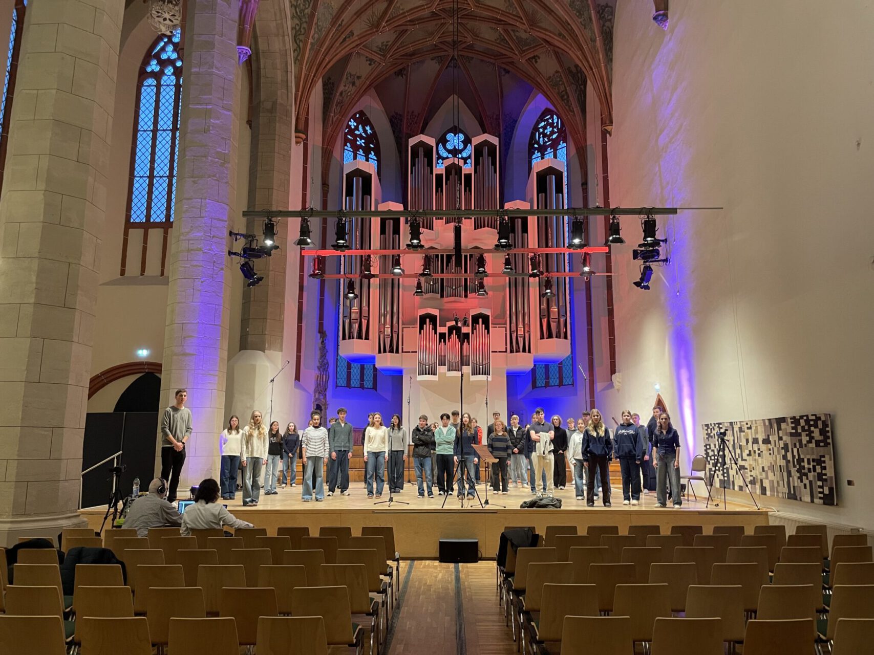 Danach stand die Ansingprobe in der Konzerthalle bzw. der Ulrichskirche an. Dort konnten wir den beeindruckenden Raum schon einmal kennenlernen und den tollen Klang ausprobieren. Nach der Probe ging es zurück in die Jugendherberge, wo ein leckeres Abendessen auf uns wartete. Um 19:30 Uhr begann dann endlich das gemeinsame Konzert mit dem Unichor mit seinem sympathischen Leiter Keno Weber, der uns noch vom Deutschen Chorwettbewerb in Hannover kannte und dieses musikalische Wochenende initiiert und organisiert hat. Die Stimmung war von Anfang an richtig gut, und das Publikum war unglaublich aufmerksam und begeistert. Das hat uns noch mehr motiviert, sodass das Singen einfach nur eine Freude war. Nach dem erfüllenden Konzerterlebnis, welches mit Rheinbergers Abendlied als gemeinsamer Zugabe beider Chöre schloss, haben wir noch mit dem Unichor Halle im Musikinstitut der Universität gefeiert. Es wurde viel geredet, gelacht und sogar getanzt – eine kleine, lustige Feier mit vielen netten Begegnungen. Irgendwann ging es dann ziemlich müde zurück in die Jugendherberge.