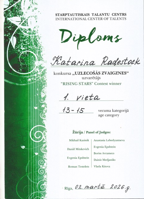 Katarina Radestock, 8d (Violine) hat beim Wettbewerb Rising Stars in Riga in der Altersgruppe 13-15 Instrumentalisten den ersten Preis gewonnen. Die Schulgemeinschaft gratuliert von Herzen zu diesem herausragenden Erfolg.